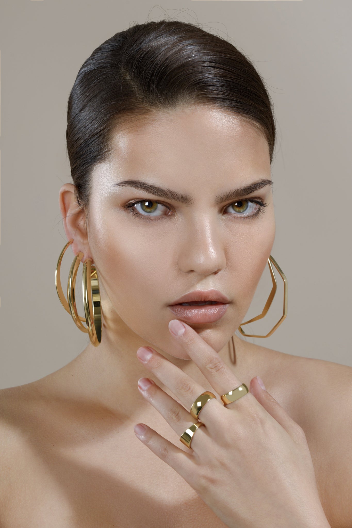1/8" wide 1/2 octagon shaped hoops with a smashed design on 1 side.